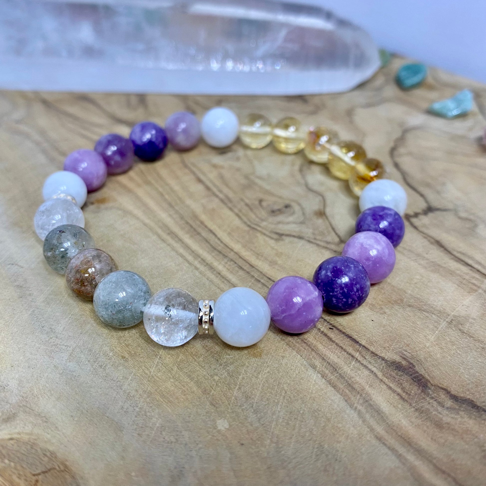 - 8 Lepidolite beads in the back help finish the bracelet with calming, stabilizing energy, symbolizing endurance, inner strength, and support through change.
