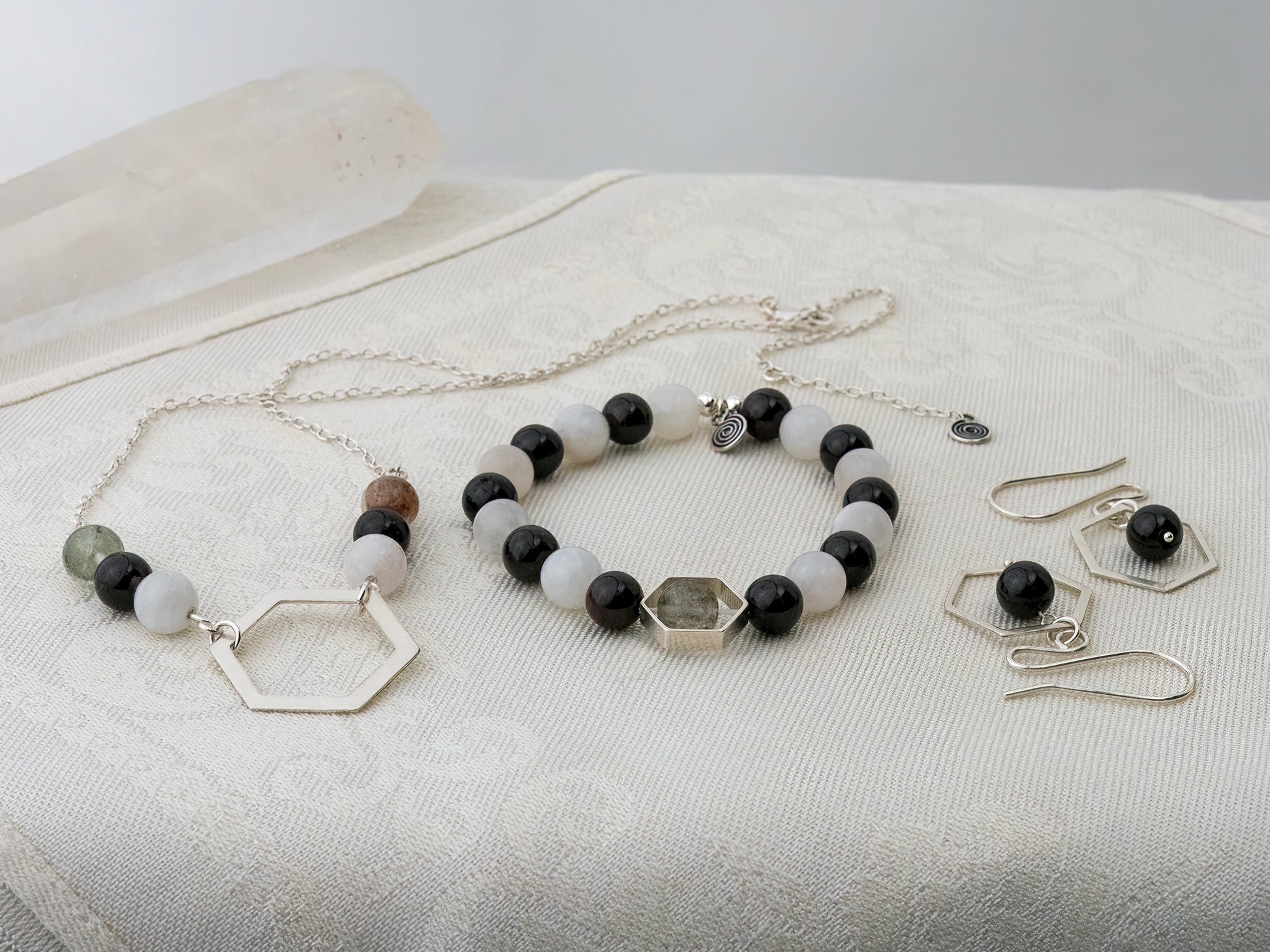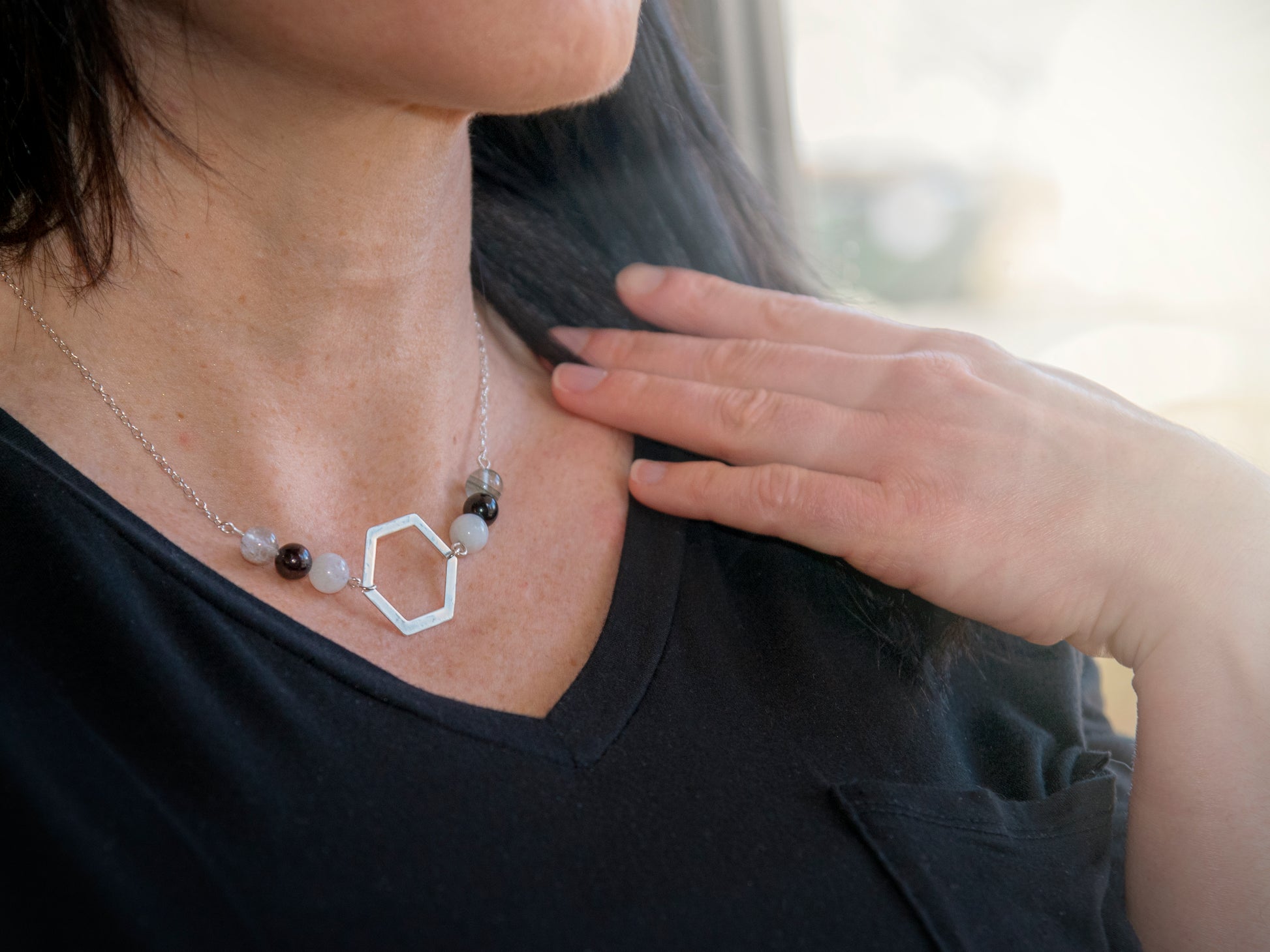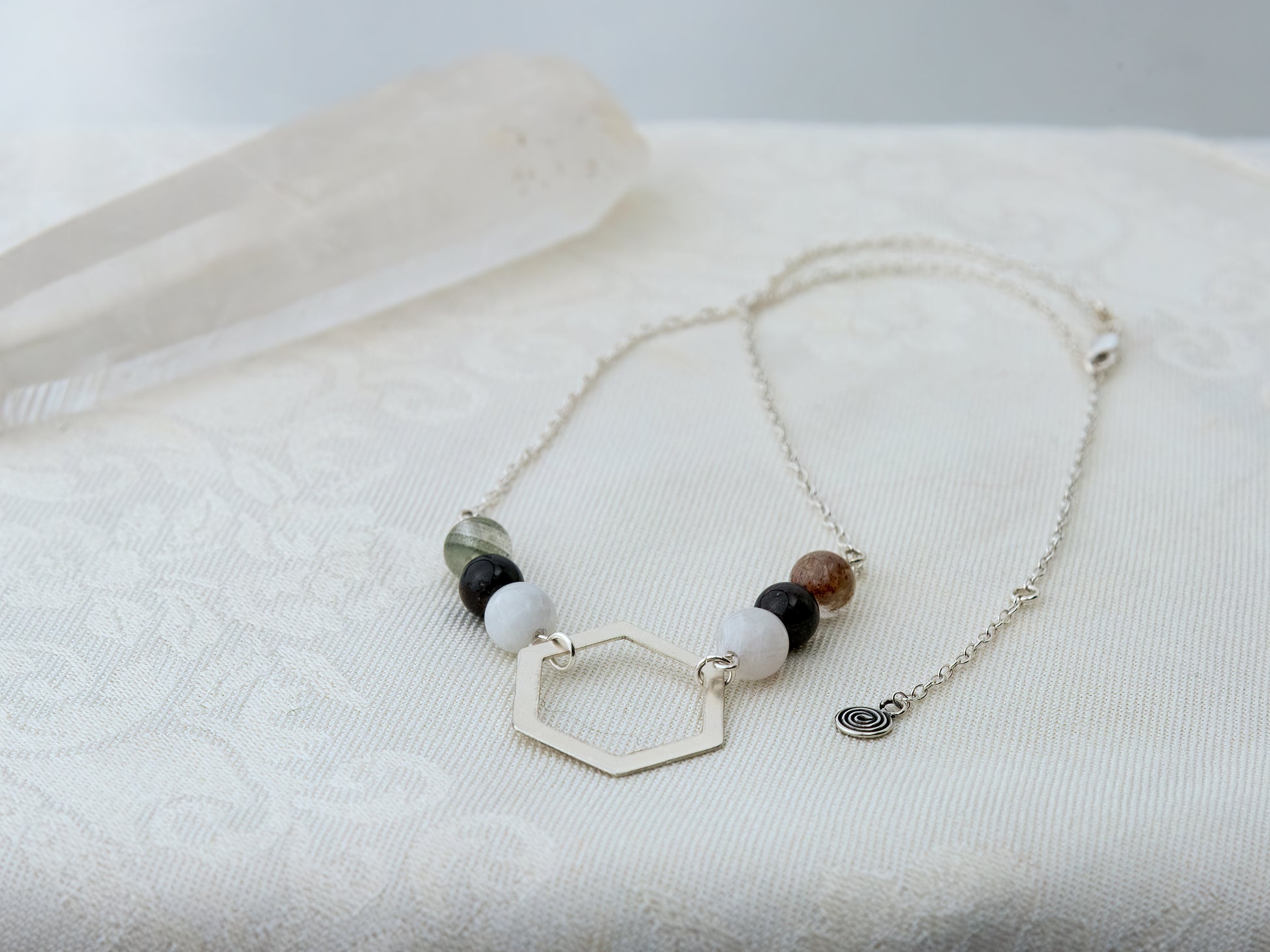 Step into the cycle of completion and renewal with the Rhythm & Rise Necklace, designed for the pivotal moments of 2025. This exquisite piece features a central hexagon pendant, a symbol of balance and efficient harmony, adorned with a triad of beads on either side—garden quartz, garnet, and moonstone—each reflecting a facet of your inner equilibrium and spiritual clarity. A delicate spiral charm at the clasp adds a touch of whimsical grace, reminding you of the continuous flow of energy and transformation that accompanies each phase of life.