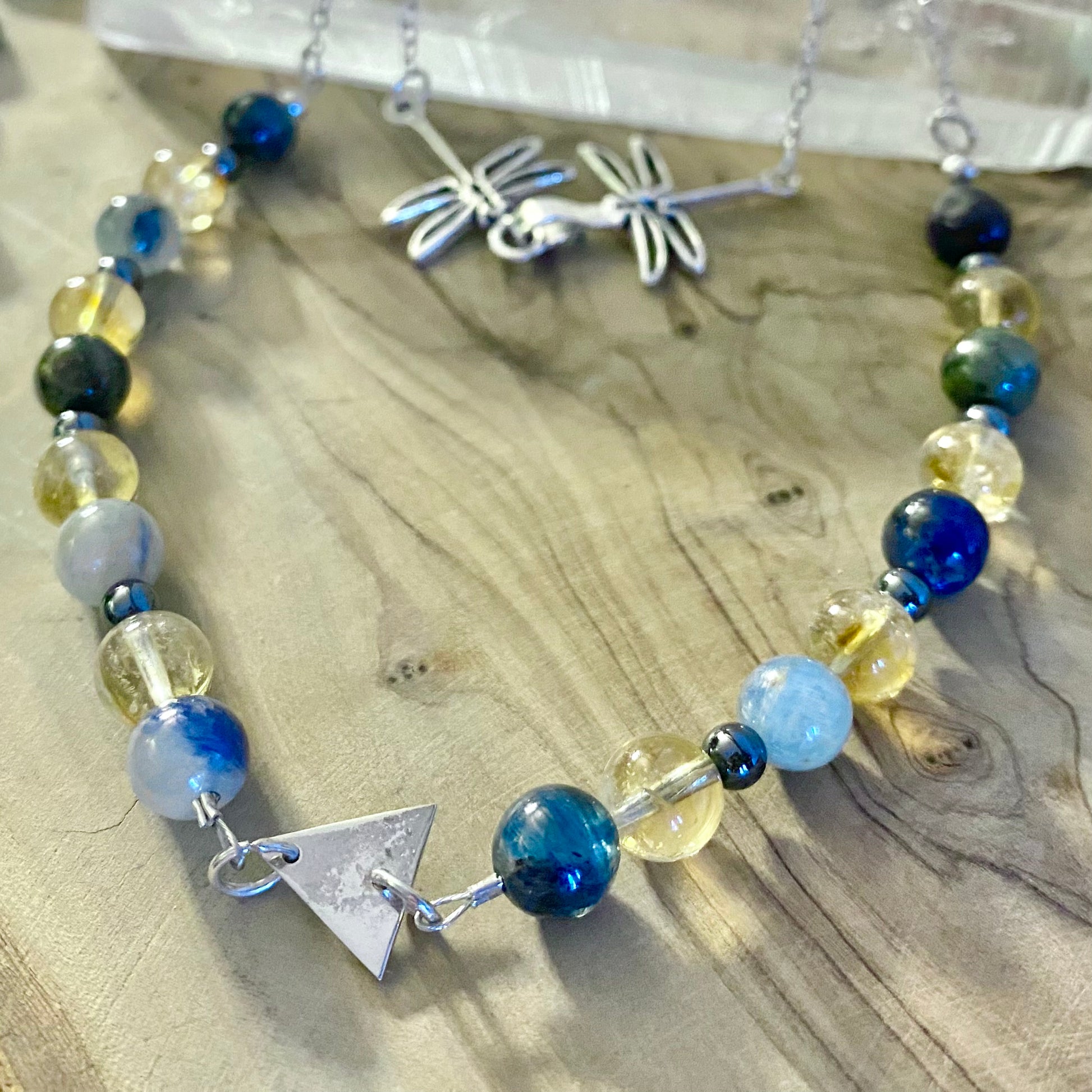 A sterling silver kyanite, citrine, and hematite necklace designed to balance light and dark, build courage capital, and help turn dreams into reality.